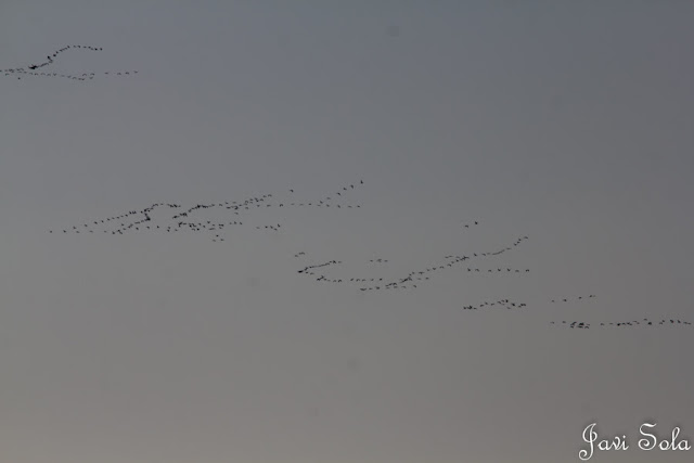 | Y a última de la tarde vi algunos grupos de grullas. Pocos pero grandes. El sábado anterior vi muchísimos grupos, aunque la mayoría pequeños |